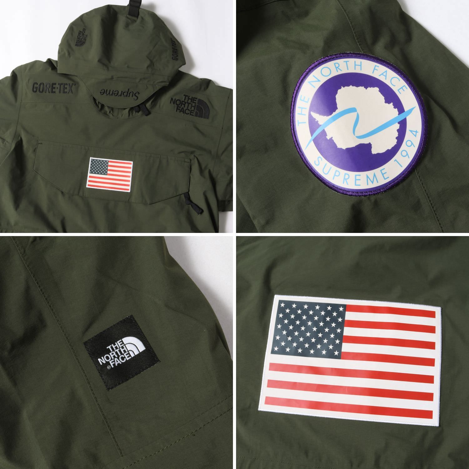 毎シーズンリリースされる“The North Face(ノースフェイス)”との大人気コラボシリーズになります。素材にはシリーズ初となる“GORE-TEX”3レイヤーナイロン生地を使用し、両面に星条旗ワッペンをあしらったプルオーバージャケットです。