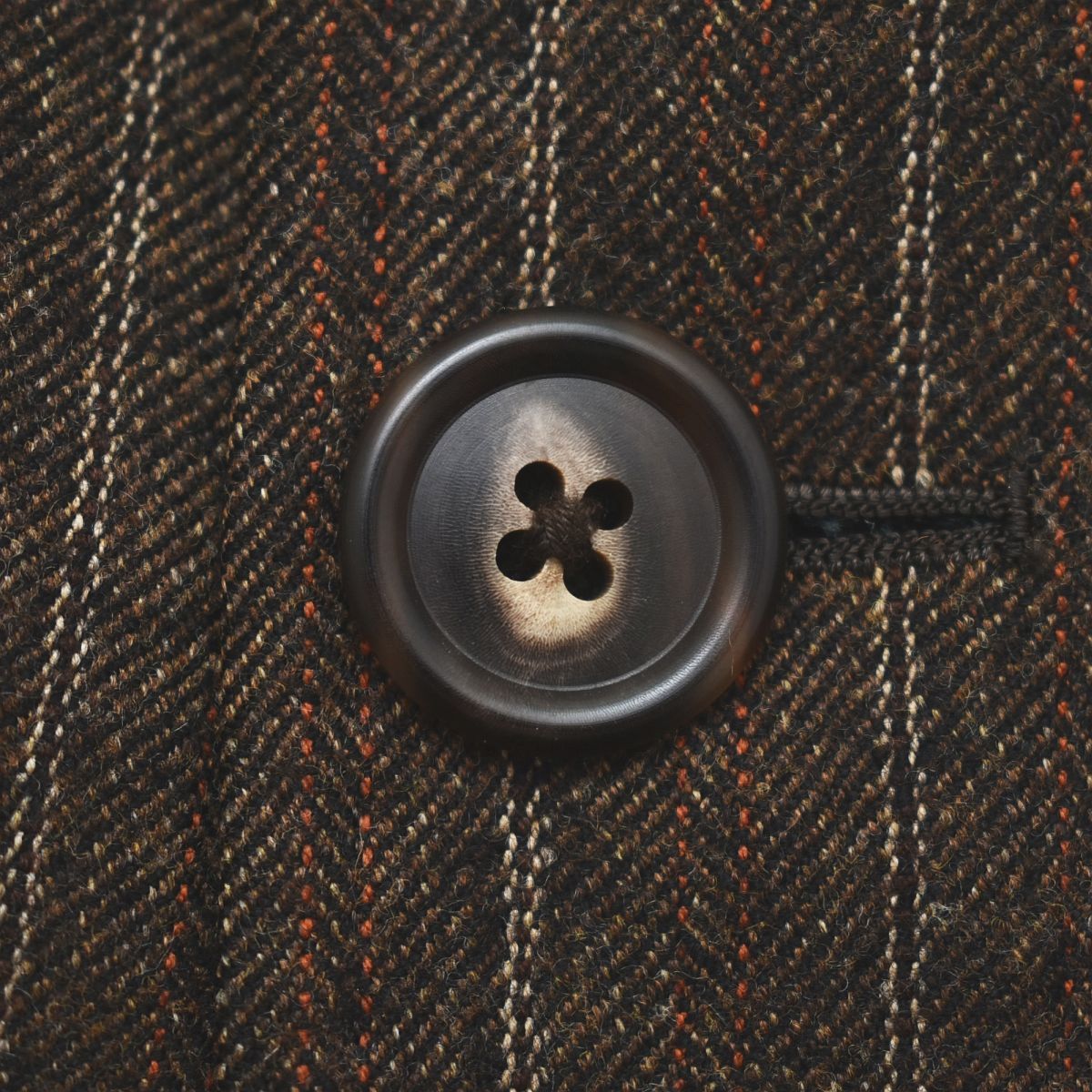 ブラウンベースに、ヘリンボーン織りとオレンジ&ホワイトのピンストライプが走る洒脱な生地感が特徴。重厚感と華やかさを兼ね備えた色柄が魅力です。