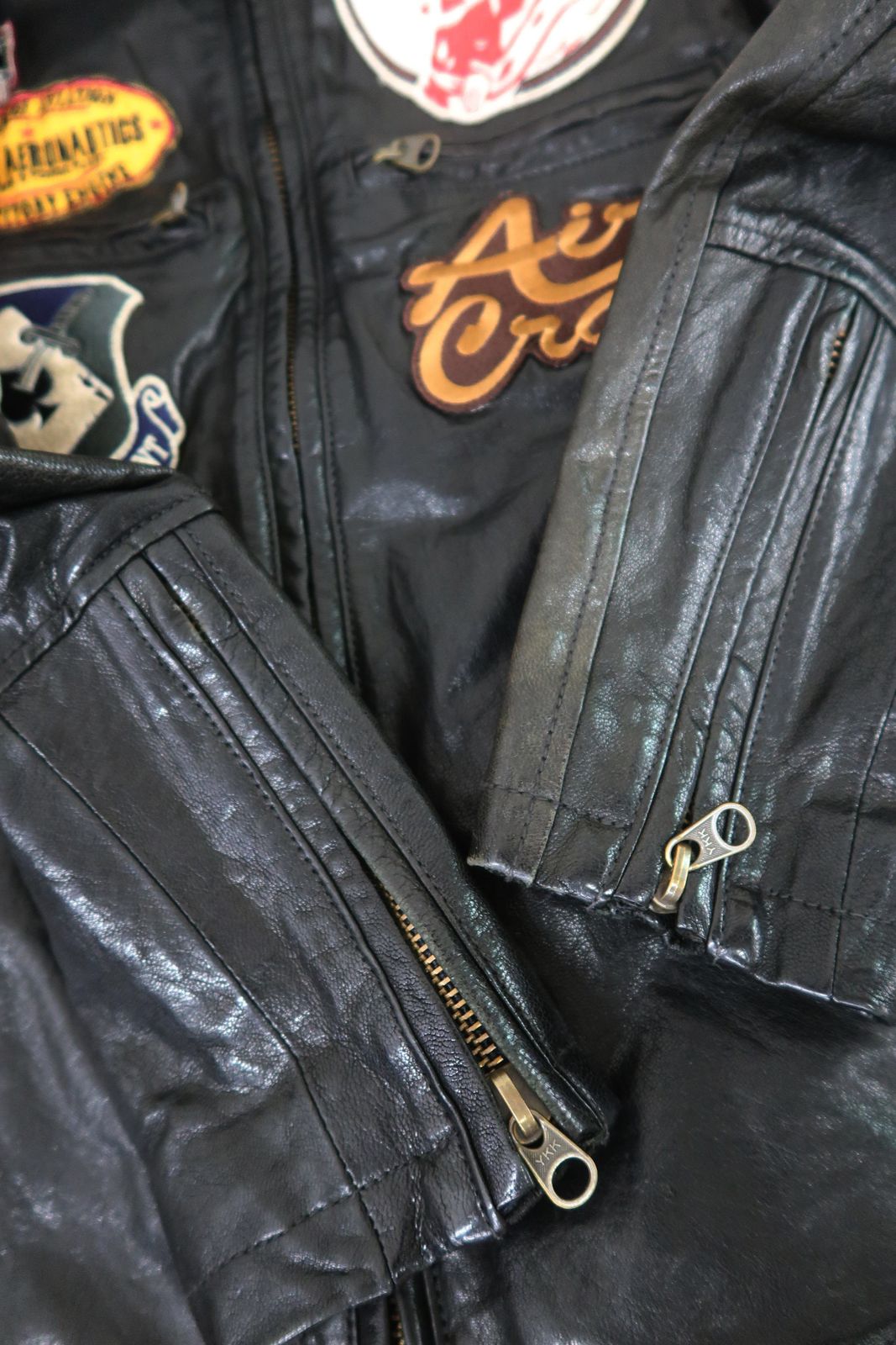 各所にシワ、スレ剥げ、袖に色褪せ、ワッペンに汚れ、金具に緑青、裏地にほつれがあります。