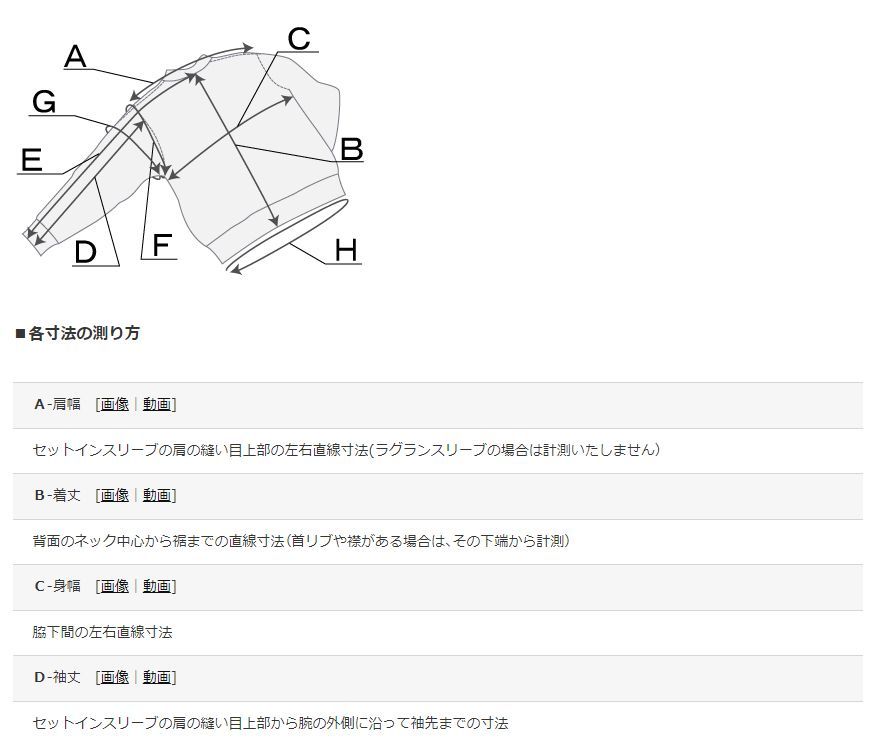 「各部実寸平均値」の測り方は、商品画像の最後の一枚でご案内しております。なお、各所実寸は、平置きにした状態(※衣類のシワを手で伸ばした状態)で測っています。
