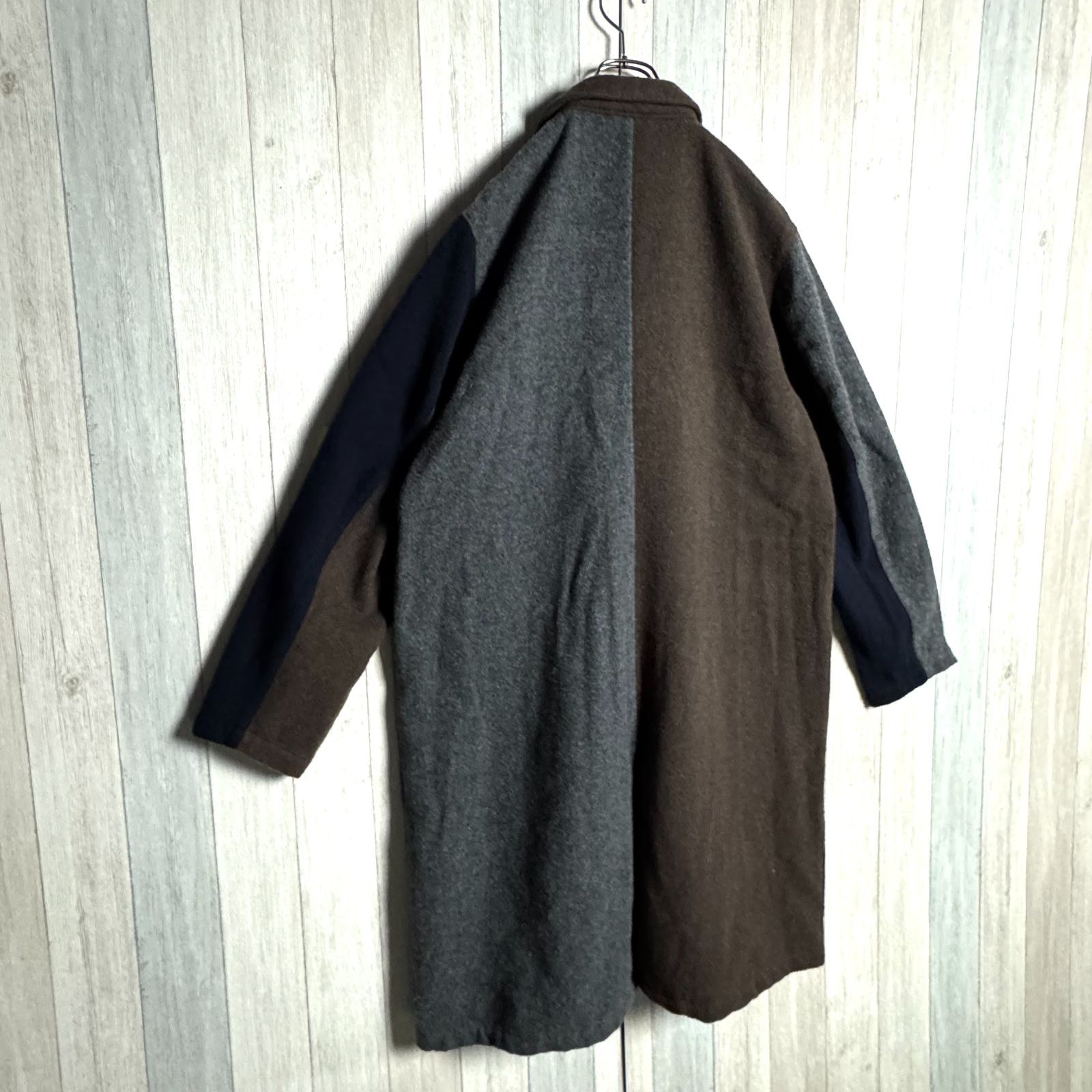 独特のクレイジーパターンが特徴的なこのウールコートは、シンプルながらも個性的なデザインが魅力です。