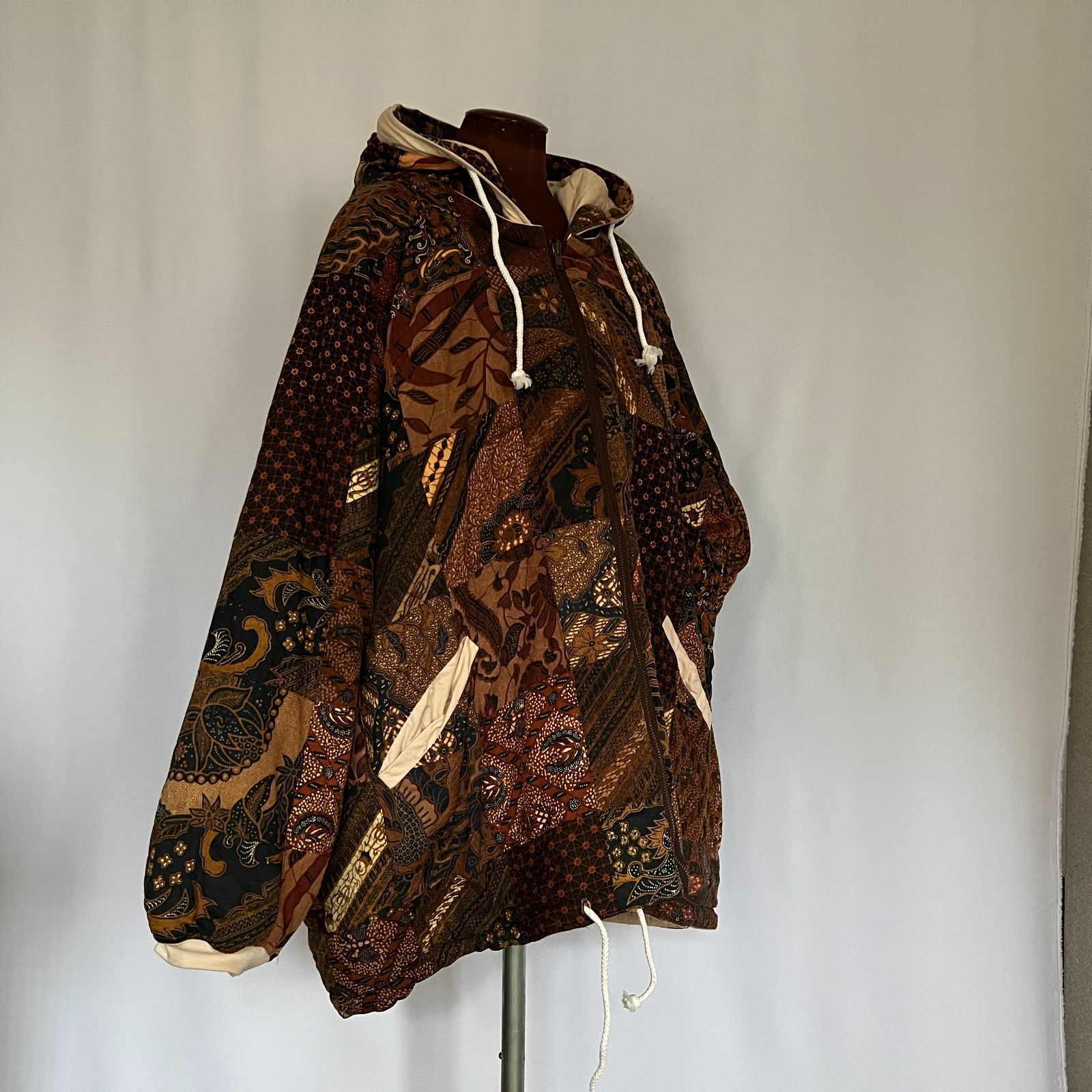 存在感のある幾何学模様のパッチワークが目を引く、厚手のヴィンテージジップパーカー。