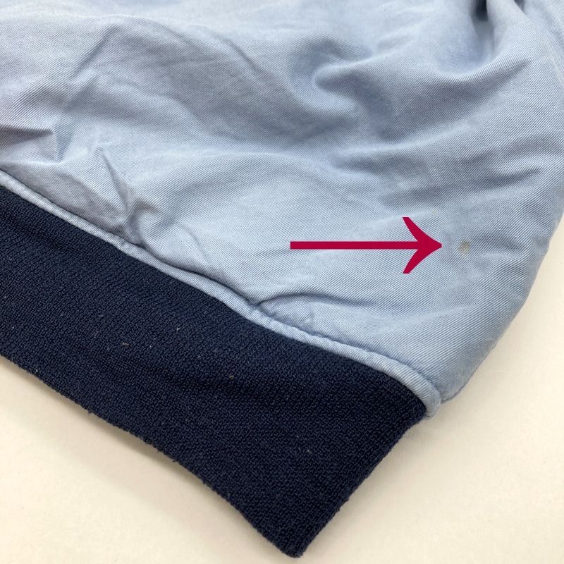 リブ部分に毛玉、毛羽立ち、表裏どちらも全体的にシミ、変色、汚れなど多数見られます。