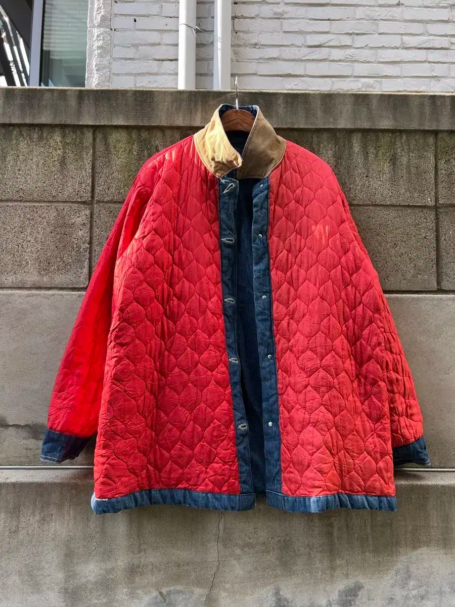 デニム生地と赤いキルトの裏地が特徴です。