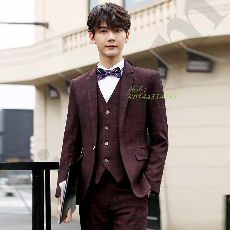 スリーピース スーツ メンズ ビジネススーツ セットアップ 結婚式 スーツセットアップ ベスト 3点セット 細身 カジュアルスーツ チェック 通勤 kni 4 a 314161